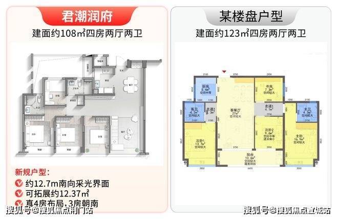 4房灵动布局(北面小房间面宽都有约2.4米),让建面约108㎡的户型,也可实现3.7米面宽开阔竖厅,让一个入门级小户型,也有约40㎡餐客厨空间,更可谓逆天设计了。要知道,哪怕当下新规产品层出,这个尺度也是少见的。