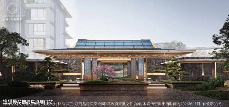 高约8米的「青云门阙」大门,用秘色瓷耀变天幕蓝陶板+孔雀金透光奢石打造的坡屋顶,寓意加官进爵。中间一对高约4米的造型黑松+山石造景,搭配两旁奥映鸣翠同款的黑底铂金钻奢石照壁,气势磅礴。