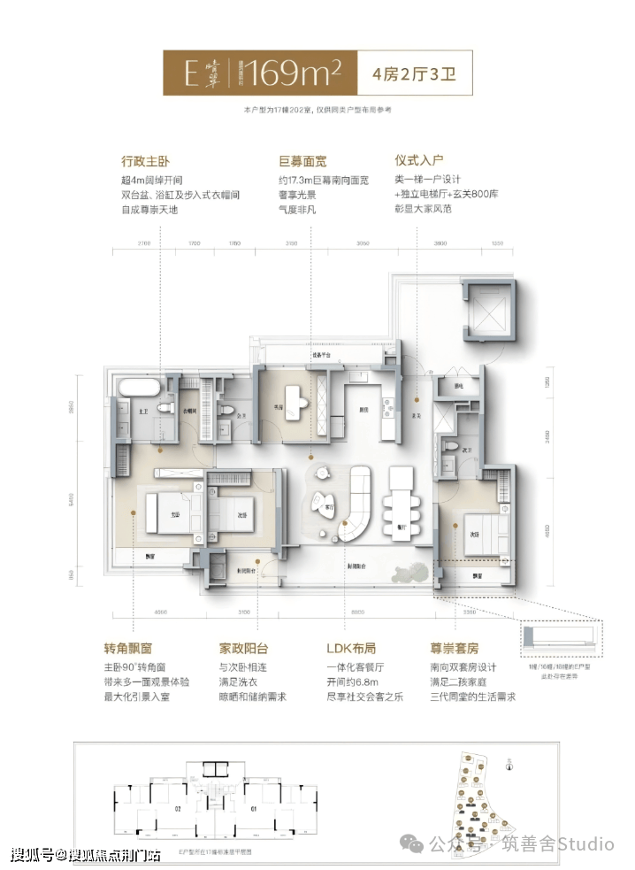 建筑面积约169㎡的四室朝南(五面宽)户型,坐拥17.3米南向超长采光面,视野无限宽广。主卧配备L型景观大飘窗,尽享美景;主卫浴缸更可实现广角景观欣赏,生活于此,犹如置身“巨幕”光影之中,舒适居住体验,不言而喻。