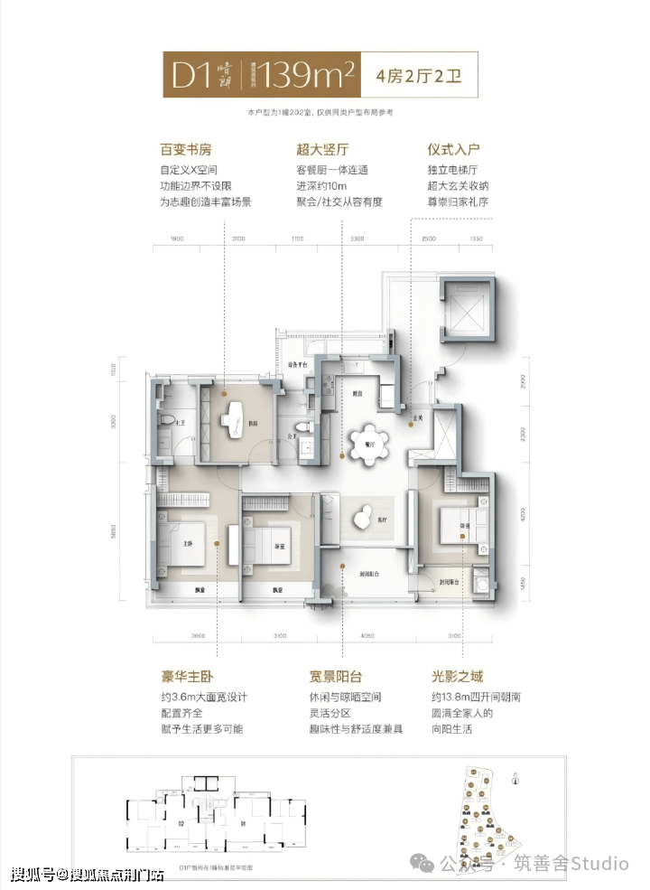 建筑面积139㎡户型,约13.8米四开间朝南,沐浴阳光,温馨满屋,共筑全家人的温暖时光。尊享仪式入门,独立电梯前厅,超大玄关,收纳无忧,彰显归家尊贵礼仪。宽敞竖厅,客餐厨一体化设计,空间进深达10米,聚会娱乐,从容自在。多功能书房,自定义空间,无限可能,打造个性化生活场景。豪华主卧,约3.6米宽敞面宽,设施完备,赋予生活更多精彩。宽阔景观阳台,休闲与实用空间巧妙分区,趣味与舒适并重。