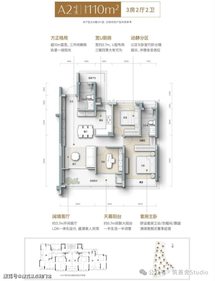 建筑面积110㎡户型,逾10米面宽,三开间朝南,尽享无遮挡阳光。宽敞客厅,约3.7米开间,客厅LDK一体化设计,连通约6.7米双联大阳台,一半是生活,一半是诗意,洋溢着家人的欢声笑语。约2.7米宽U型厨房,巧妙分隔公区与卧室,让三餐四季的空间更加井然有序。豪华主卧套房,配备舒适卫浴、衣帽间及飘窗,尽享度假式的奢华生活体验。