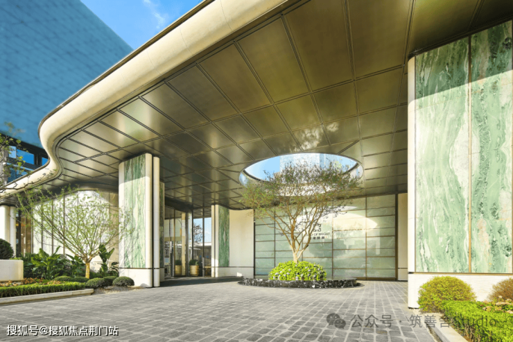 主入口大门以其宏伟的尺度彰显端庄与大气,高达7米的门庭让人瞬间感受到尊贵的气息。此门庭选用贝金米黄石材、维多利亚绿与白雪公主奢石,搭配古铜色金属板,巧妙融合冷暖色调,营造出极具张力的美学效果,开启都市奢华新境界。每一细节都透露出非凡的贵气。圆形镂空穹顶之下,一株近7米高的紫薇树卓然而立,阳光倾泻而下时,尽显“紫气东来”的祥瑞意韵。