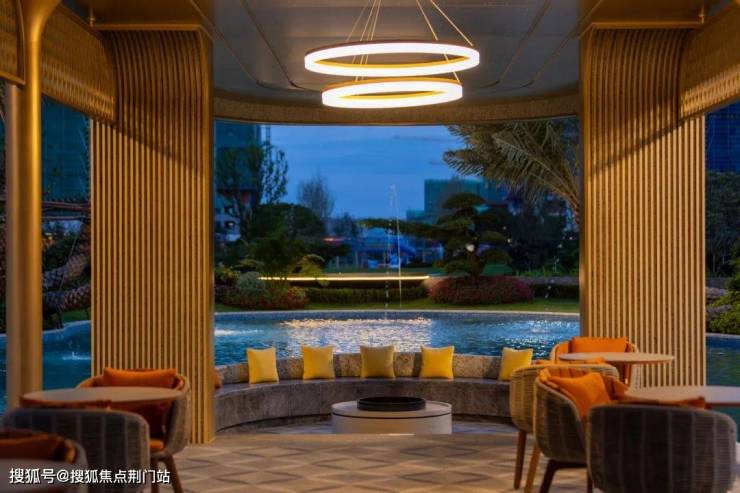 整个户外会客厅处于景观中轴之上,从池边向中央“生长”,靠近中央的位置还特地做了一个下沉空间,在蔚蓝的水池间涌动出度假的松弛感。