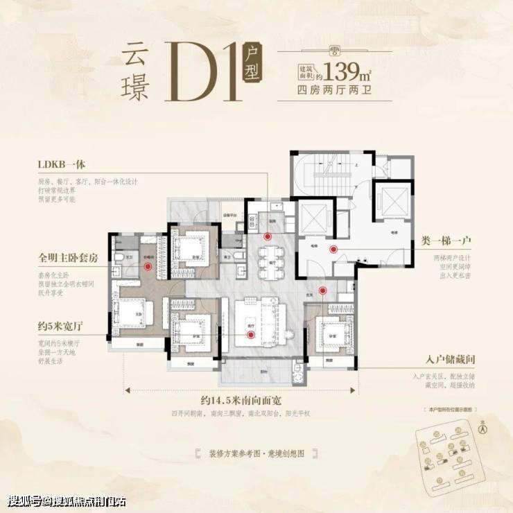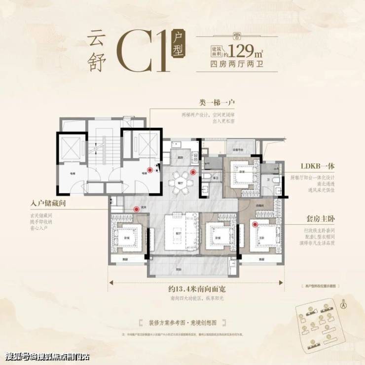 建面约129㎡两梯两户,带独立入户电梯前厅,采用四房两卫格局。南向约13.4m 的面宽,三房全部朝南,采光优异。LDKB南北设置,满足各自独立空间的使用,餐厅可以摆放圆桌或者长条桌。