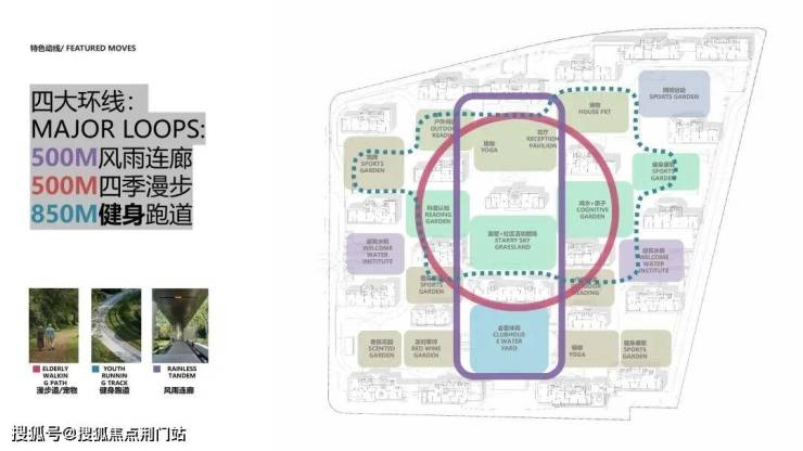 再叠加一圈约850米长的慢跑道,在风雨连廊和风景步道之间,大致呈东西向串连。