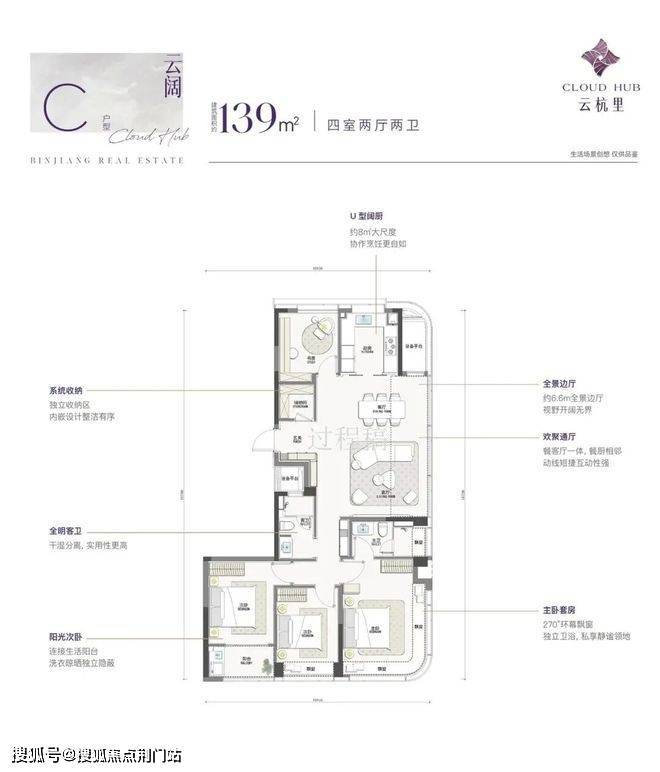 建面约139方4房2厅2卫边套,实得率约91%,布局“优秀”。全封闭式阳台,三面采光,观景视野无敌。