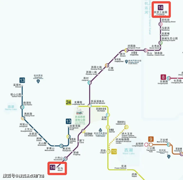杭州地铁14号线分为南北两段,北段从崇贤开始,途经运河新城、西溪湿地。南段从小和山开始,一直到富阳西站,全程60多公里,沿途与地铁2、3、5、10、19号线均可换乘。