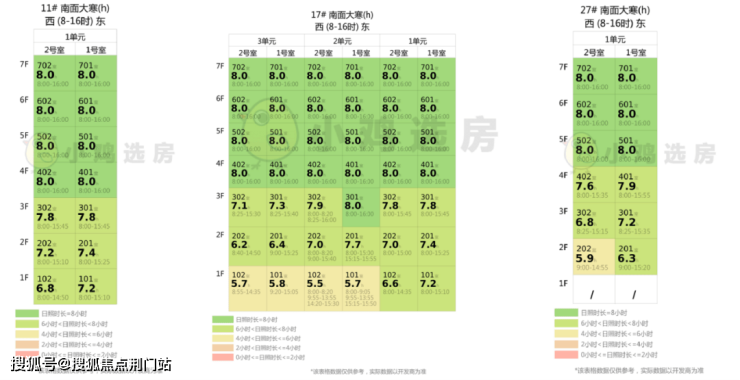 针对 11#、17#、27#三栋楼的大寒日日照情况来看,几乎所有房源都能达到6h以上的日照时长,即便是低楼层,也都能够交出 超5.5h的炸眼数据,生活舒适感爆棚。