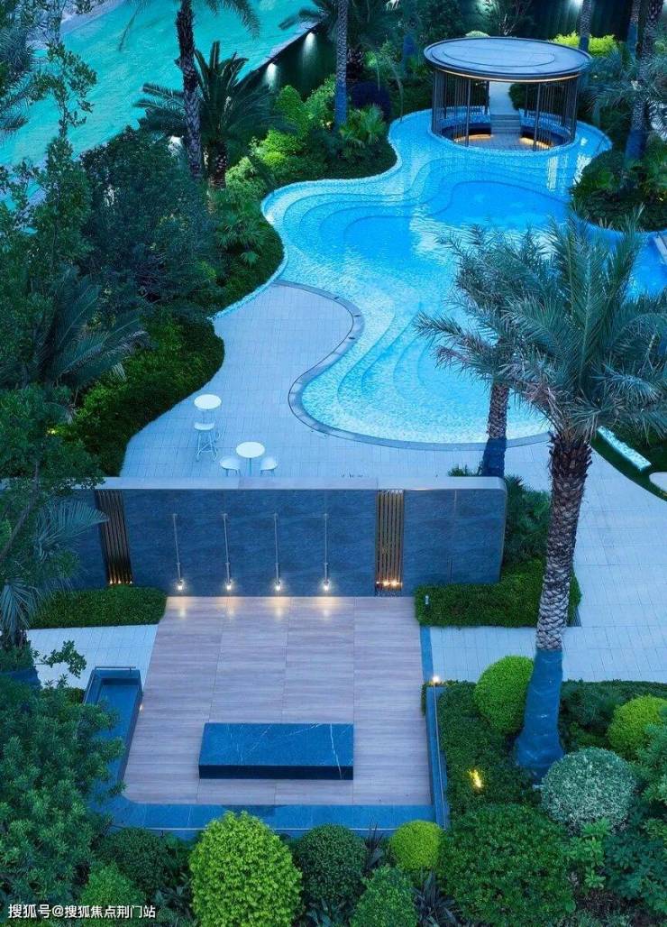 已经实景呈现的蒂芙尼蓝中心戏水池,水池边一道道弧形曲线,池底精致的马赛克拼花,透着满满的热带度假风,在配上水池旁挺拔的银海枣等热带植物,未来业主们往水池边一趟,仿佛就置身在东南亚的海滩边的高级度假酒店。