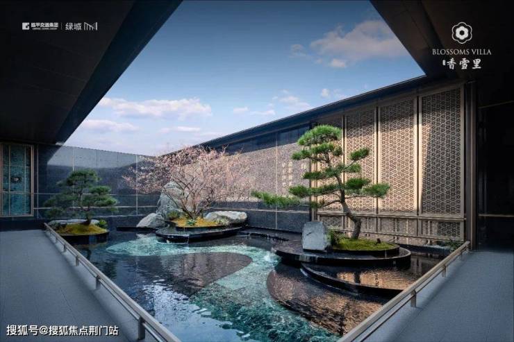 建筑立面:古今交融的诗意表达:外立面以香槟金铝板为基调,搭配蓝眼睛石材与玻璃幕墙,融合传统歇山重檐、纳福悬鱼等元素,既保留宋式建筑的对称美学,又赋予现代建筑的轻盈通透。合院组团采用三面庭院设计,L型景观面与环绕式檐廊,将超山梅影、丁山湖光引入每一扇窗景!