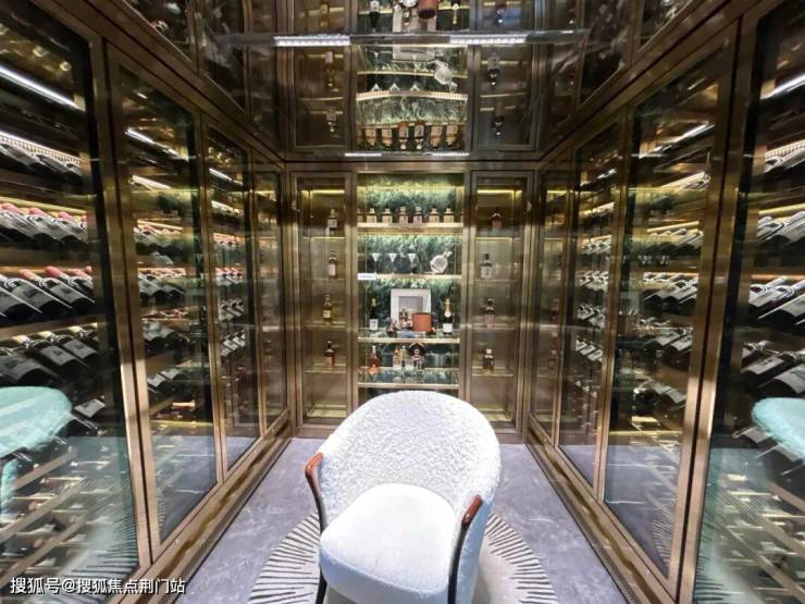 从静心凝神的茶室走几步,就到了藏酒饮酒的开放式会客空间,墙上橱柜码着主人从各处精心搜罗回来的上等佳酿。