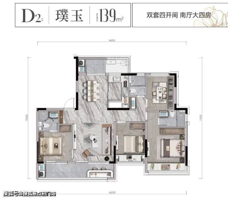 建面约139㎡户型,四房三卫,东西各有一个套房;餐客厅一体,公共区域非常大,而且还是南北双阳台;南向开间约14米3,完全是大宅尺度,三代同堂居住也不会拥挤。