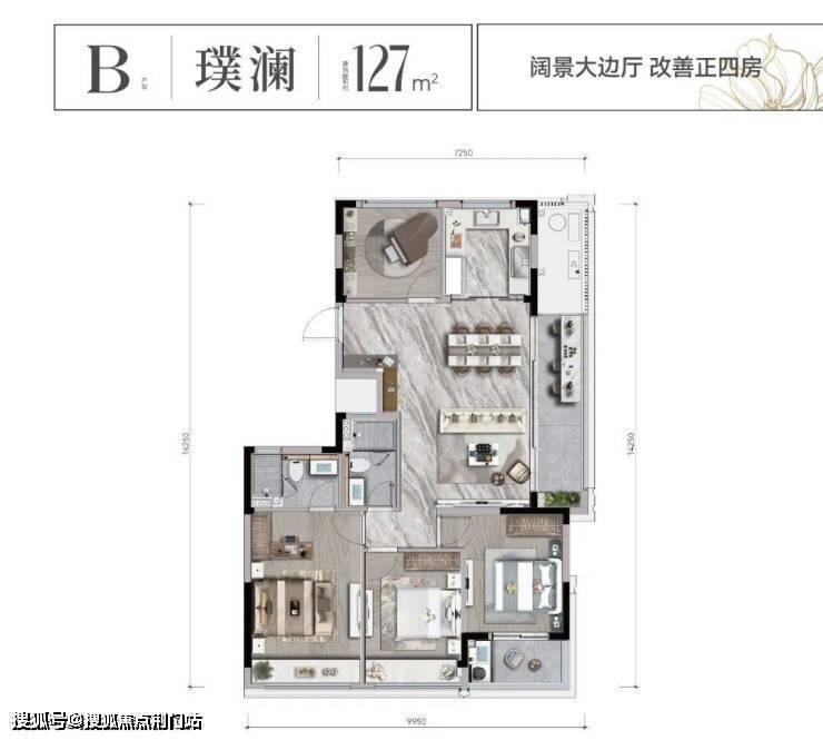 建面约127㎡户型,市场面上罕见的三房朝南纯边四房户型, 边厅大阳台,带约6.2米边厅+宽景阳台,南向面宽达到近10米,朝南的三个卧室,每一个都配上了飘窗或阳台。
