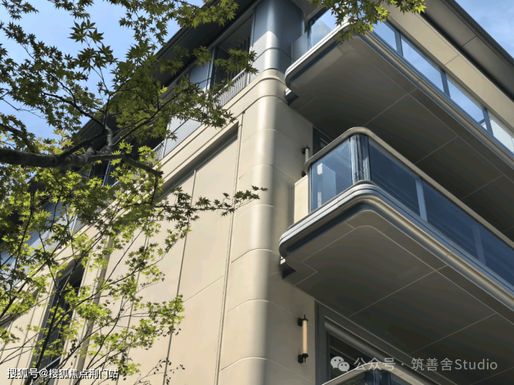 湖山丽舍巧妙运用暖色调石材与铝板的和谐拼接,精心复刻出自然与人工的和谐秩序。每一石面都经过细致雕琢,弧线流畅、倒角精致、线槽深邃,宛如将一首宏伟的交响乐转化为触手可及的立体雕塑。继而,以大量玻璃栏板和落地窗的巧妙搭配,以及阵列式长窗的独特设计,为建筑注入了无限灵动与通透之美,完美契合现代审美的潮流与生活的舒适需求。