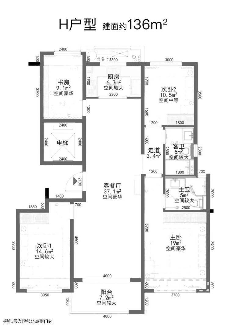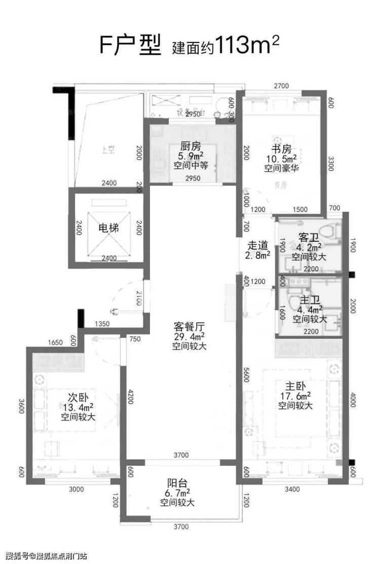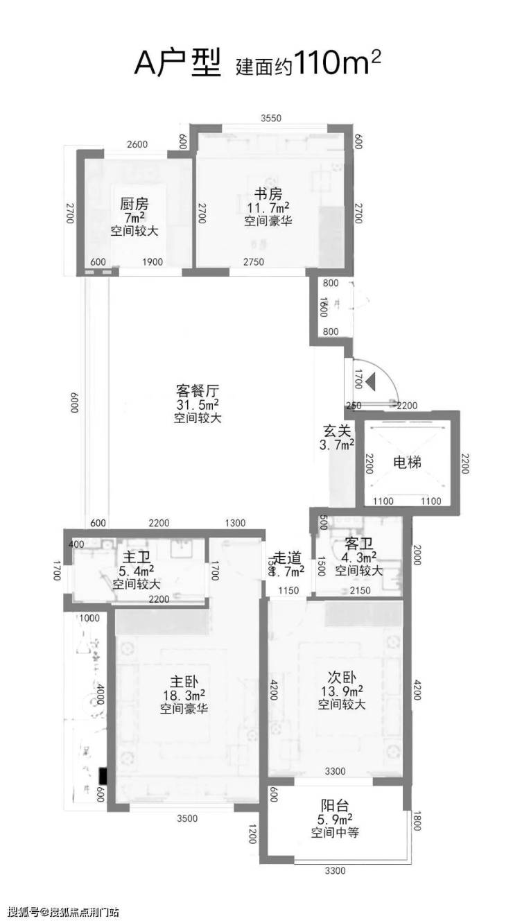户型点评:餐客厅带阳台,主卧、次卧带飘窗,书房面积也不小,整体均好性强。
