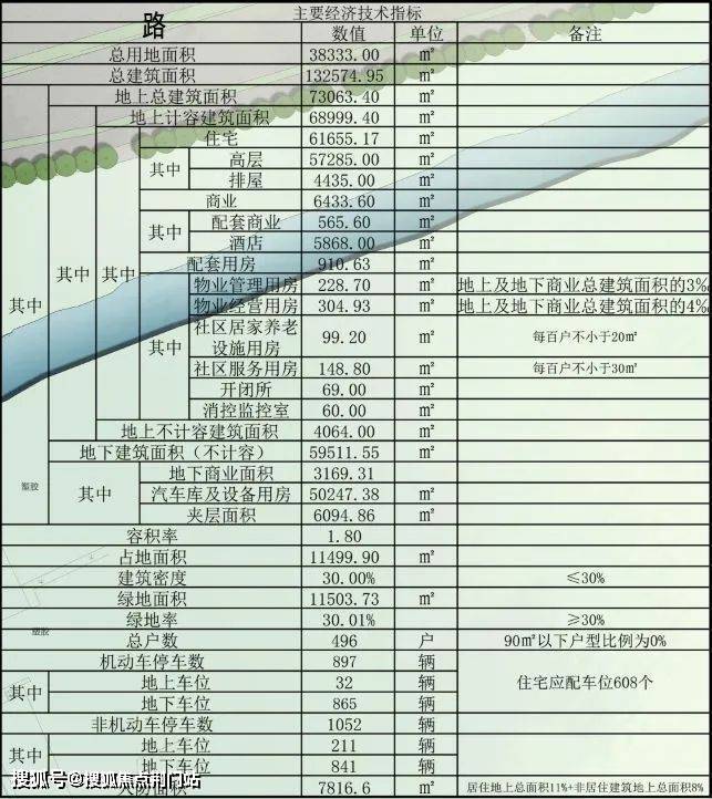 项目基本信息:总用地面积38333㎡(约57.5亩),地上总建筑面积68999.40㎡,建筑密度30%,容积率1.8,绿地率30%。