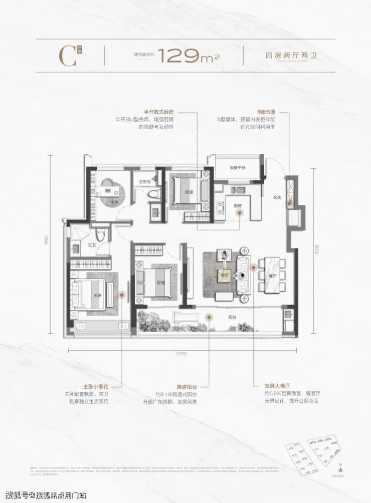 建面约129平方米四房两卫和99平方米三房两卫的户型,也都各有亮点。前者具有宽屏大横厅和约9.1米跑道阳台,后者也具有约6.35米的起步双联阳台,视野开阔。