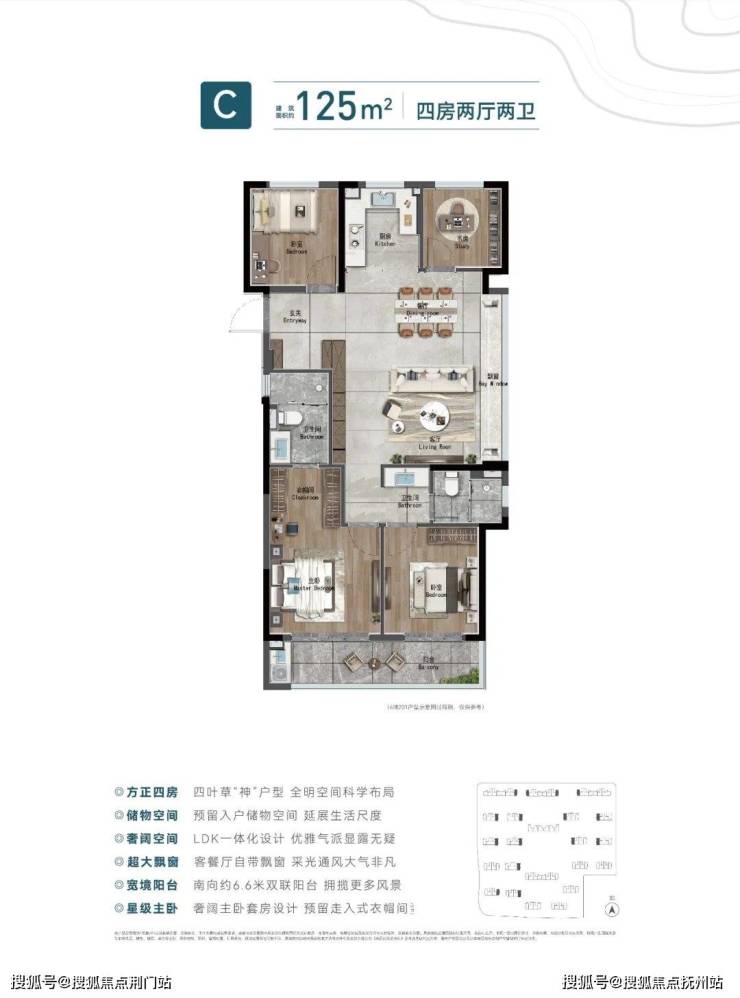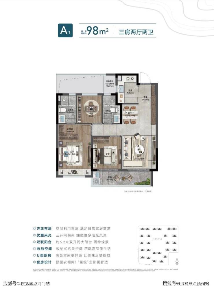 中建·潮阅尚境府总户数1689户,户型面积段分为建面约98方、105方、125方、135方、139方五种,其中主力户型为98方的三房两厅两卫的中间套和边套,合计逾千套。98方三房两厅两卫边套户型,是市面上稀缺的边套小户型,但相对很多其他项目,中建·潮阅尚境府在户型细节上,做到了更舒适。