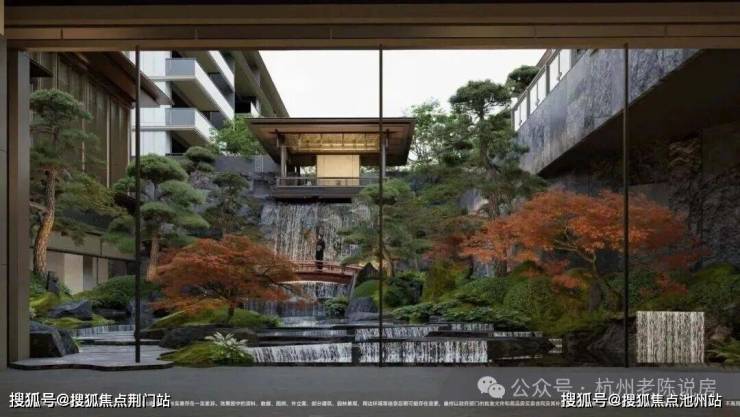 5. 取意三大宋画,融合杭州山水精粹,园林布局「一轴八境」展开,通过假山、叠水、屏风等元素,串联起移步易景的园林场景,再现刘松年的《四景山水图》。