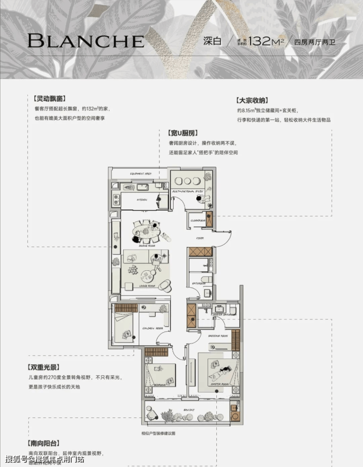 其中约132㎡户型,四室两厅两卫,南向双阳台。空间尺度上,做到了边厅约4.5米的采光面,开阔的LDK厨房、餐厅、客厅、飘窗一体空间;