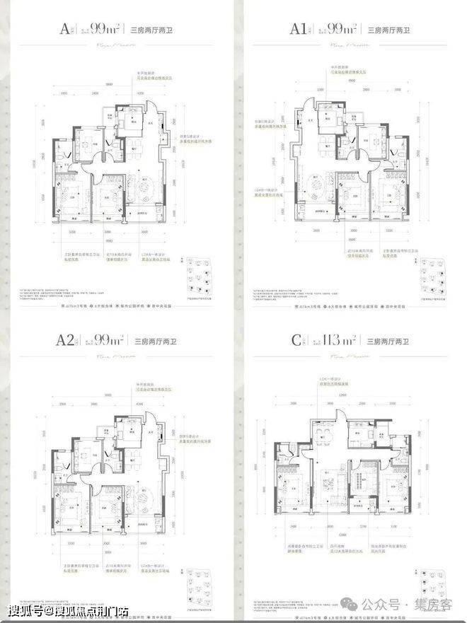 型设计:建面约99㎡的三房两卫户型,动静分区,采用三开间朝南设计。建面约113㎡的三房两厅两卫户型,四开间朝南,拥有封闭式阳台,南向采光充足,使得整体空间更加宽敞明亮。