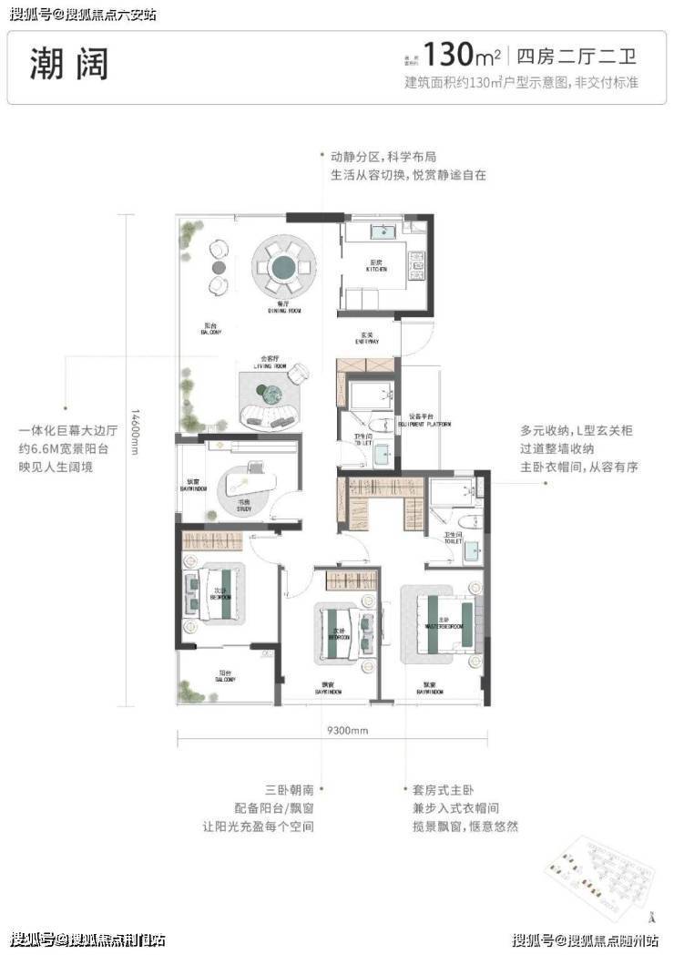 建筑面积约130㎡打造全明大四房,三卧朝南,配以270°巨幕边厅,造极“全面屏”环景视野。