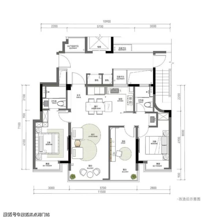 当然,预算更高的可以看看——刚改旗舰边套户型:建面约114方四房两卫。