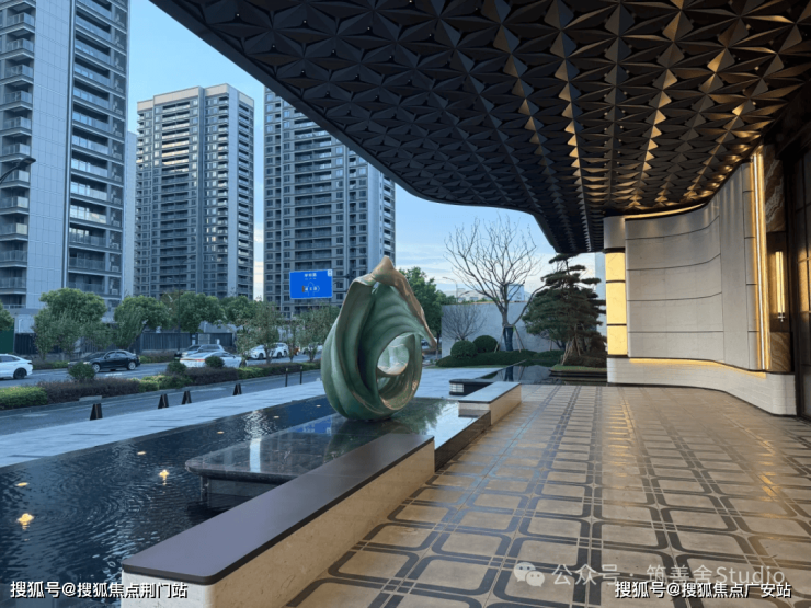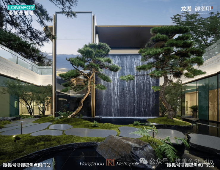下沉式艺术庭院,6米悬挑水帘,与玻璃穹顶相映成趣,光影交织间,坐拥湖景,品一杯咖啡,氛围感拉满。