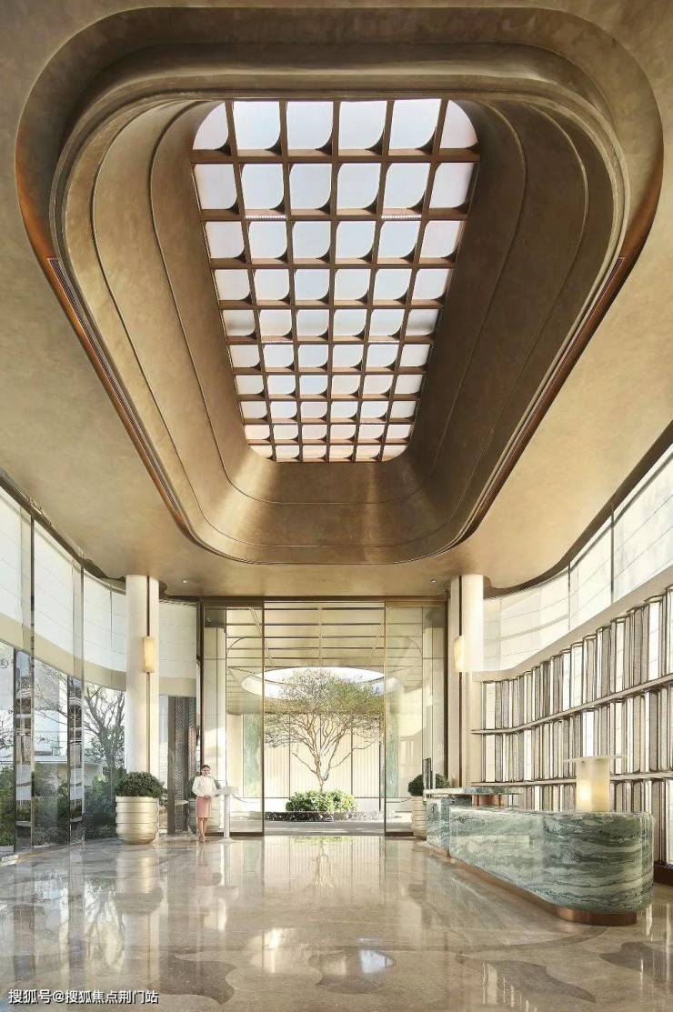 主入口大门高度达到了约7米,置身其中,尊贵气派。选用贝金米黄石材、维多利亚绿与白雪公主奢石,搭配古铜色金属板,巧妙融合冷暖色调,营造出极具张力的美学效果。