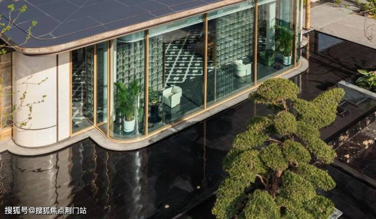 立面方面, 汲取现代轻奢法式的白金美学灵感,叠加大面玻璃,打造出光影灵动的对称式金色画框立面。