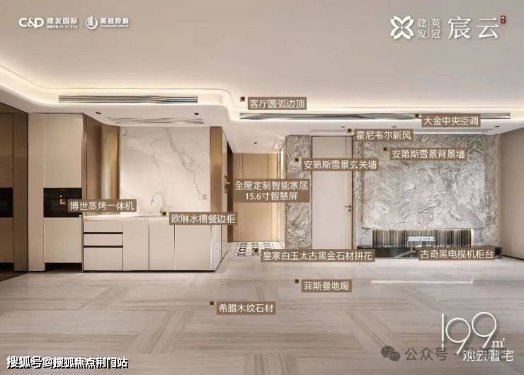 在室内精装上,宸云也采用超高的精装标准:大金中央空调、霍尼韦尔新风、博世洗碗机、博世蒸烤一体机、方太油烟机、方太燃气灶等,餐等运用大面积石材,堪称“奢石博物馆”,全屋还定制了让生活更有秩序和整洁的收纳体系,高层户户赠送储藏柜。