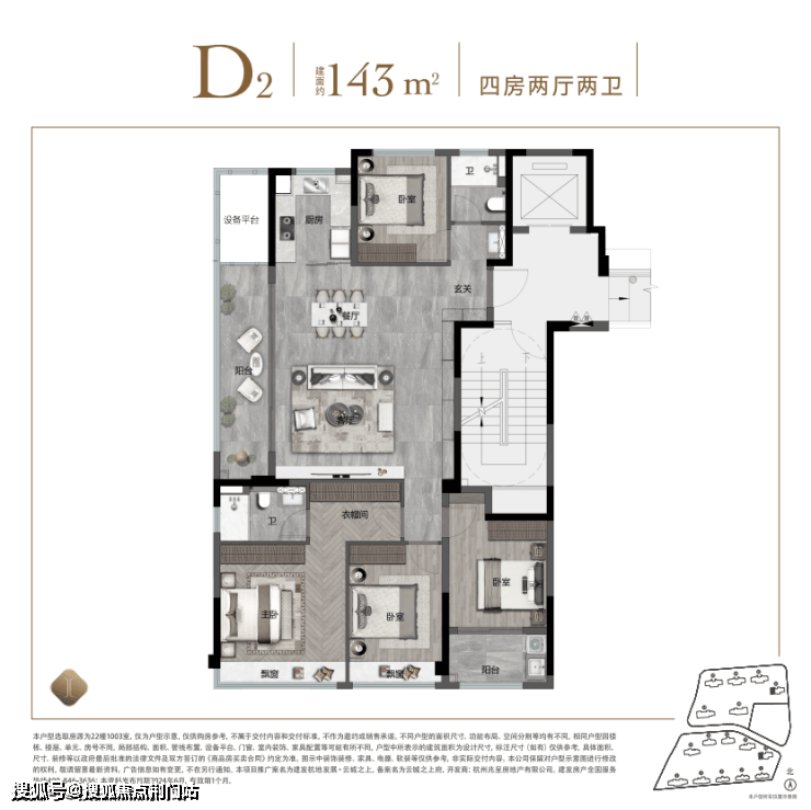 如果你仔细看户型图右下角的户型位置图,你会发现,143户型正对小区中央景观,拥有无敌景观视野的同时,又解决了以往边厅户型最大的缺点:居家隐私