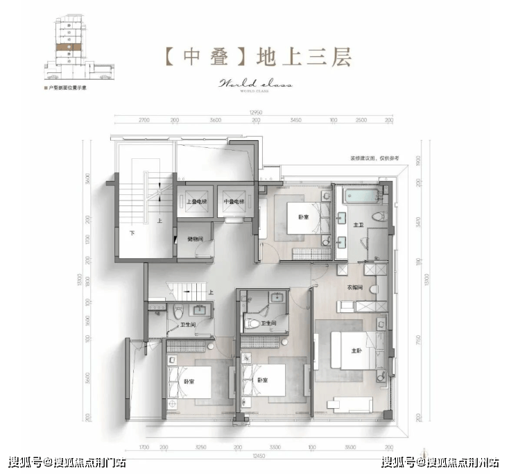 它的户型跟中下叠不一样,中下叠的格局都是居住区四个房间,包含朝南的三个套房。而上叠的居住层只有三个套房,北面是没有卧室的,取而代之的是一个步入式衣帽间。所以上叠的主卧是更加宽敞的。