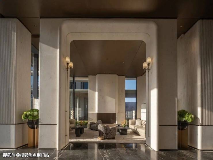 这些石材的质感很有玉琮的温润感,也是精挑细选过的,他们在致敬良渚文明。玉琮的元素,会以不同形态嵌入楼盘各个节点。