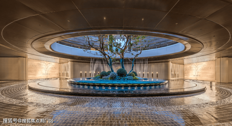 没错,元序出场就是板块首个!板块内首个豪奢大门,由设计大师孟凡浩创作的光环门廊,超百米宽、近11米挑高,中央动态艺术装置“揽星舟”,两侧约8米加纳利海枣与约5米塔形罗汉松,一眼望去豪奢大气,业主倍有面子。