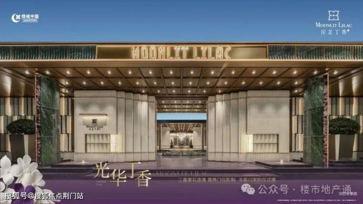 步入示范区,踏入空中廊桥,底部就是下沉式庭院(会所);接着进入圆厅,正中央一个巨大的丁香花瓣雕塑悬空而下,和案名遥相呼应,仪式感从此刻凸显