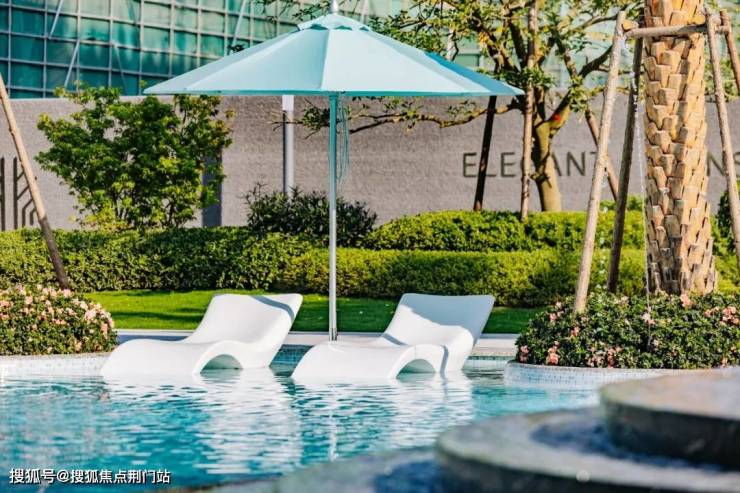 作为一个低密的纯洋房大盘,翠栖府在园区中央打造了颠覆性的 “六翠之境”:目之所及是一片通透的蒂芙尼蓝,镜面泳池里波光粼粼,倒映着蓝天白云,是真正的“天空之镜”,与边上高大的棕榈树、白色的躺椅、繁茂的绿茵,彼此映衬,海边度假风油然而生。
