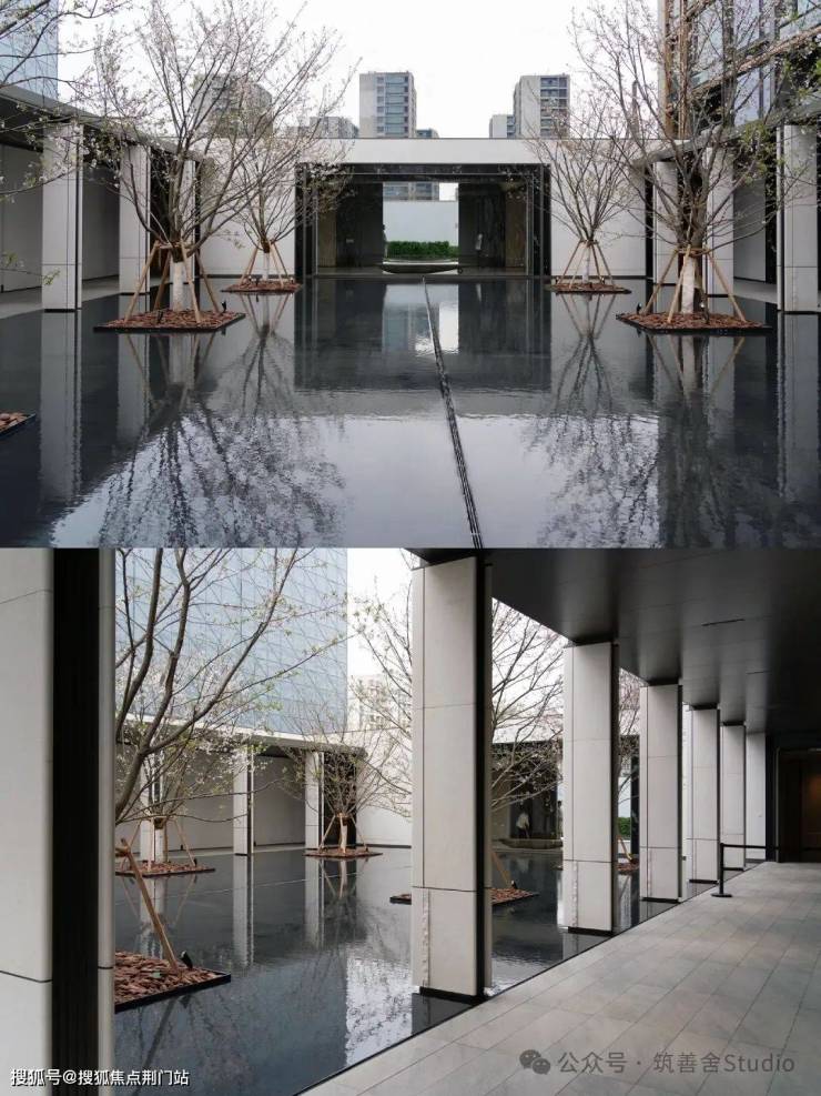 【小区大门】沐新月门头较之前的两个项目作了焕新升级,更显沉稳大气。入门瞬间,目光所及,尽是错落有致、对称排列的悬浮树阵,美感与秩序并存,令人忍不住踏入其中一探究竟。独具匠心的「水上树阵」,其下是一座如镜的水院,清澈见底,映照着天光云影,营造出树影漂浮于空中的奇幻意境。这「漂浮树阵」,与别具一格的门头相得益彰,一步踏入,即刻感受与世隔绝的优雅气质。
