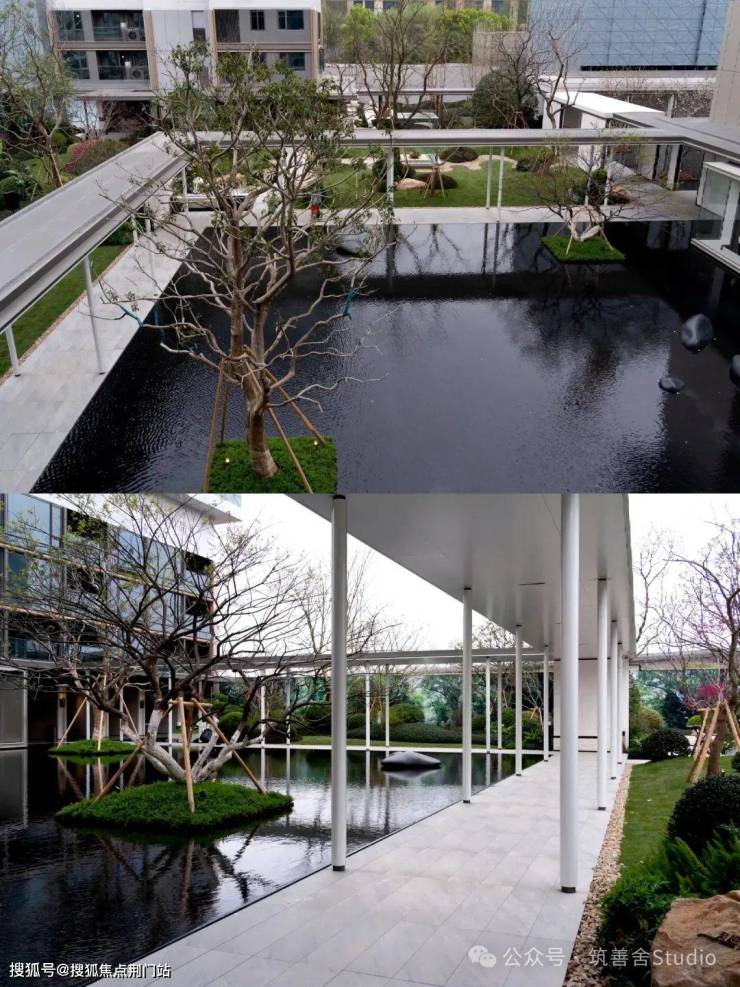 前面序厅中水上树阵的核心理念在于对称与“悬浮之美”,而步入园区中心,这座水院的焦点则是“环抱之韵”,这一设计创新,开创了前所未有的空间体验。