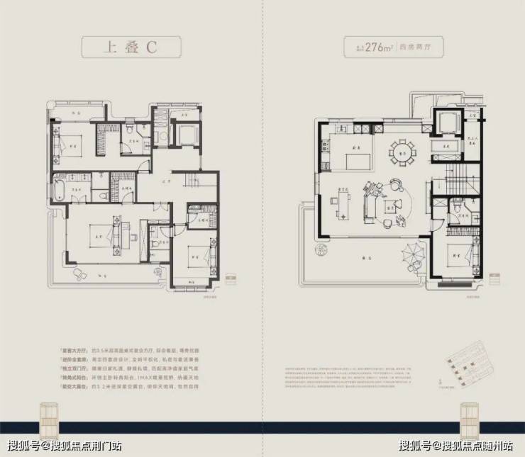 空间设计充分发挥了纯四层叠墅的产品优势,上下叠的独立入户,上下叠独立的归家动线,互不干扰。此外,上叠卧室静区在三层,客餐厅放置在四层、外联大露台,有效避免了与下叠休息静区的彼此干扰,动静分层有序处处有景。