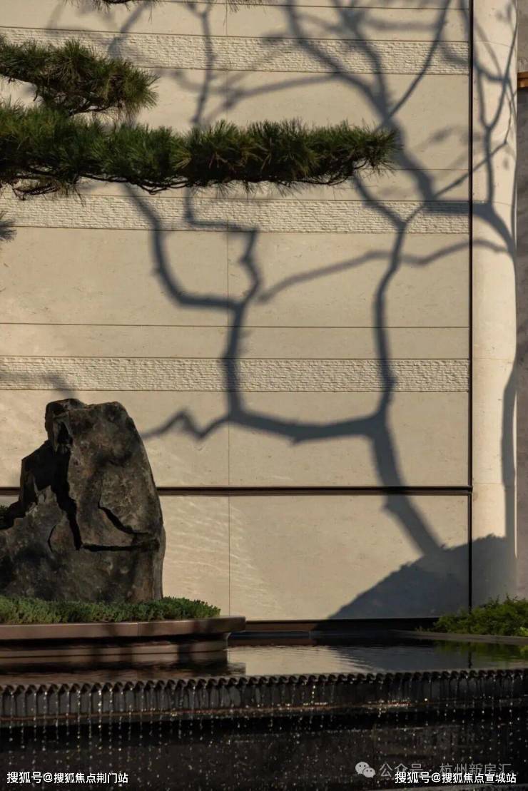 御潮印的下沉式园林打造了世纪城独一份的约300㎡飞瀑松院。园林中央精选多棵名贵泰山松,高度统一近6米,运用全冠移植技艺,入园即是最佳观赏形态;不远处近6米高飞瀑倾斜而下,实现庭院三级叠水,瀑布声和叠水声混合成一曲自然乐章,动静结合,多了些赏玩之趣。