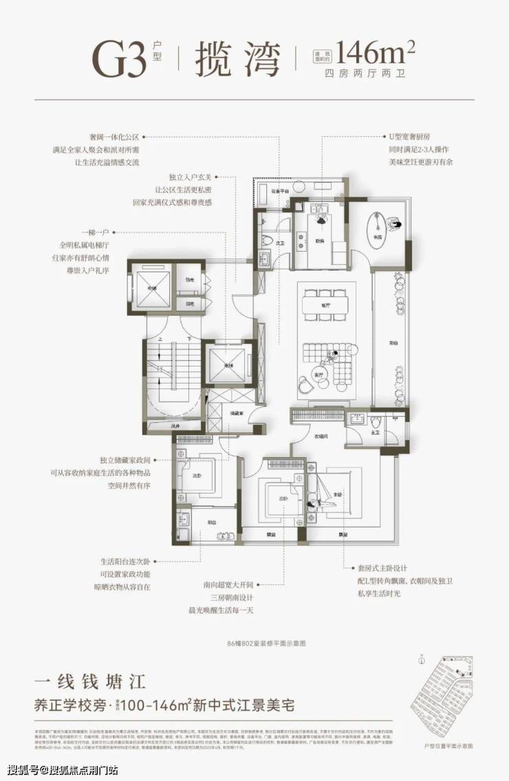 建面约146㎡则分为横竖两款,全部一线朝江。两梯两户,都有独立电梯厅。“横版”是四开间朝南+大方厅,“竖版”有大边厅+超长转角飘窗的“全景舱主卧”。