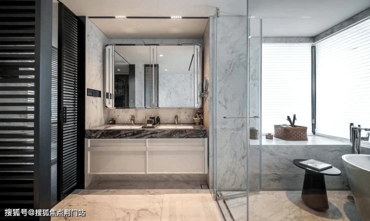 即便只是建筑面积约145㎡,主卫也做了高奢酒店才有的杜拉维特双台盆,亚马逊绿奢石的台面,冰岛翡翠,丝毫不逊市面上装标8000元/㎡的华宅。