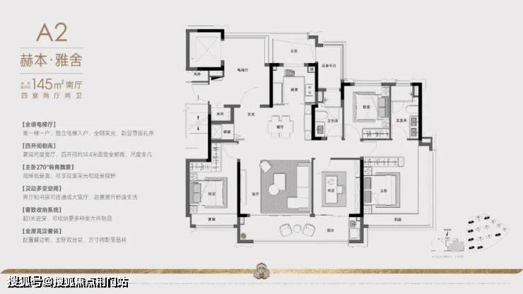 最先亮相的建筑面积约145㎡南厅户型,还带独立电梯厅。主卧的270°转角飘窗,以罕见的极窄边框技术,叠加超大面玻璃,尽享无边界的视野采光。