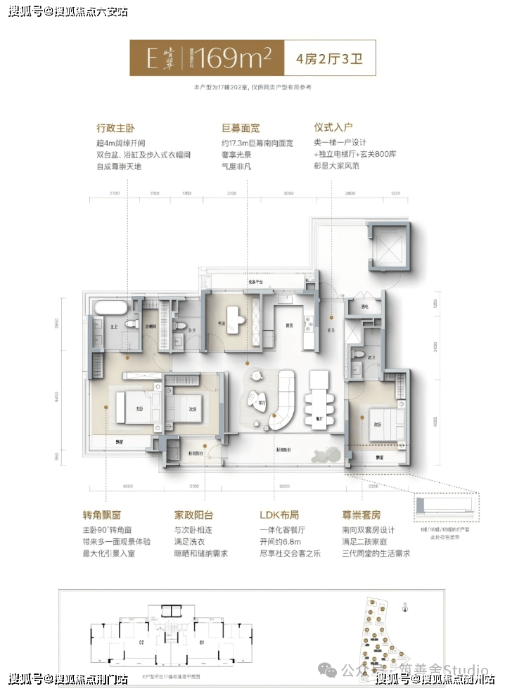 建筑面积约169㎡的四室朝南(五面宽)户型,坐拥17.3米南向超长采光面,视野无限宽广。主卧配备L型景观大飘窗,尽享美景;主卫浴缸更可实现广角景观欣赏,生活于此,犹如置身“巨幕”光影之中,舒适居住体验,不言而喻。