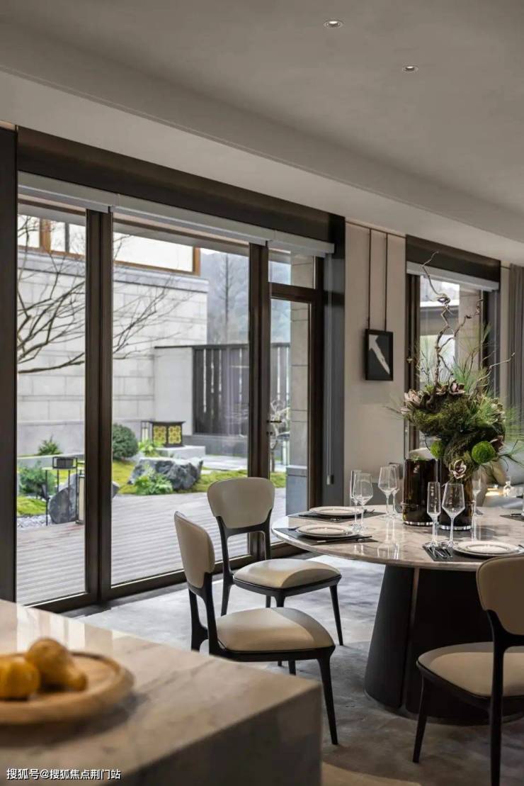 传统中式宅院往往有白墙易脏、采光不佳等不足,玺园·长流的外立面就用上了大面积玻璃、桃木色铝板、米白色石材,质感更高级,也更耐得住岁月磨洗。
