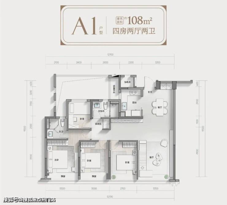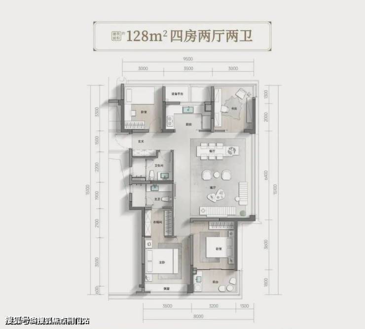 128平方米户型做到了四房两卫,包了阳台,餐客厅整个空间很宽敞,约38平方米。