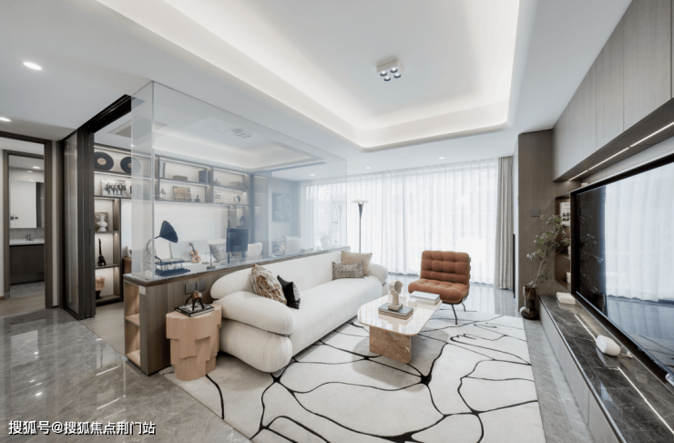 约 9.7 米宽幕三开间: 客厅 +南向双卧一字排布,清晨阳光漫进主卧飘窗,正午为客厅镀上暖光,傍晚次卧仍能捕捉落日余晖,让每个空间都有 “ 阳光游弋 ”的通透感。