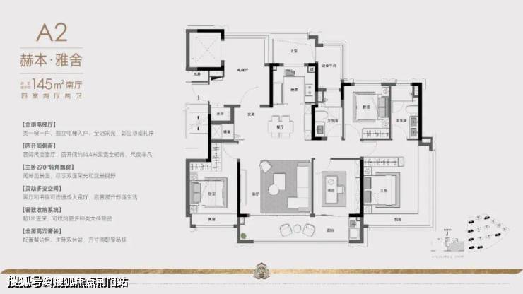 最先亮相的建筑面积约145㎡南厅户型,还带独立电梯厅。主卧的270°转角飘窗,以罕见的极窄边框技术,叠加超大面玻璃,尽享无边界的视野采光。