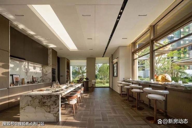 门庭。这里特指单元门庭,通高约4m,气势恢宏。大面积的金属屋檐外挑,彰显贵胄的同时,又扩大遮风挡雨的面积。进门左侧,色彩饱满的普拉达绿竖版镶嵌,美学传达与奢华品质相辅相成。进门后,又是大幅岩板上墙,气质拉满。